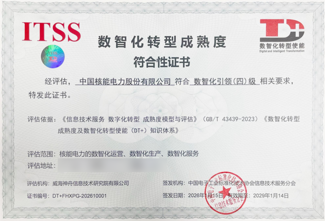近日,中国电子工业标准化技术协会信息技术服务分会(以下简称“ITSS分会”)正式向中国核电颁发数智化转型成熟度“数智化引领(四)级”符合性证书。中国核电凭借在数智化转型领域的系统性实践与卓越成效,率先达成数智化转型成熟度四级要求,为核电行业乃至全国数智化转型提供了可参考、可推广的标杆范式。