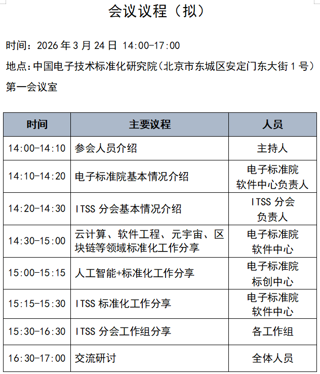 为了给会员单位提供多角度、丰富多彩的会员活动,加强会员与研究机构之间的联系互动,中国电子工业标准化技术协会信息技术服务分会(ITSS分会)联合中国电子技术标准化研究院定于2026年3月24日在北京市举办交流活动。本次活动在电子与信息技术领域标准研制权威机构-中国电子技术标准化研究院实地开展,旨在帮助会员单位系统了解软件和信息技术服务领域标准化工作情况,欢迎各相关单位专家代表积极报名参会。具体事项通知如下。